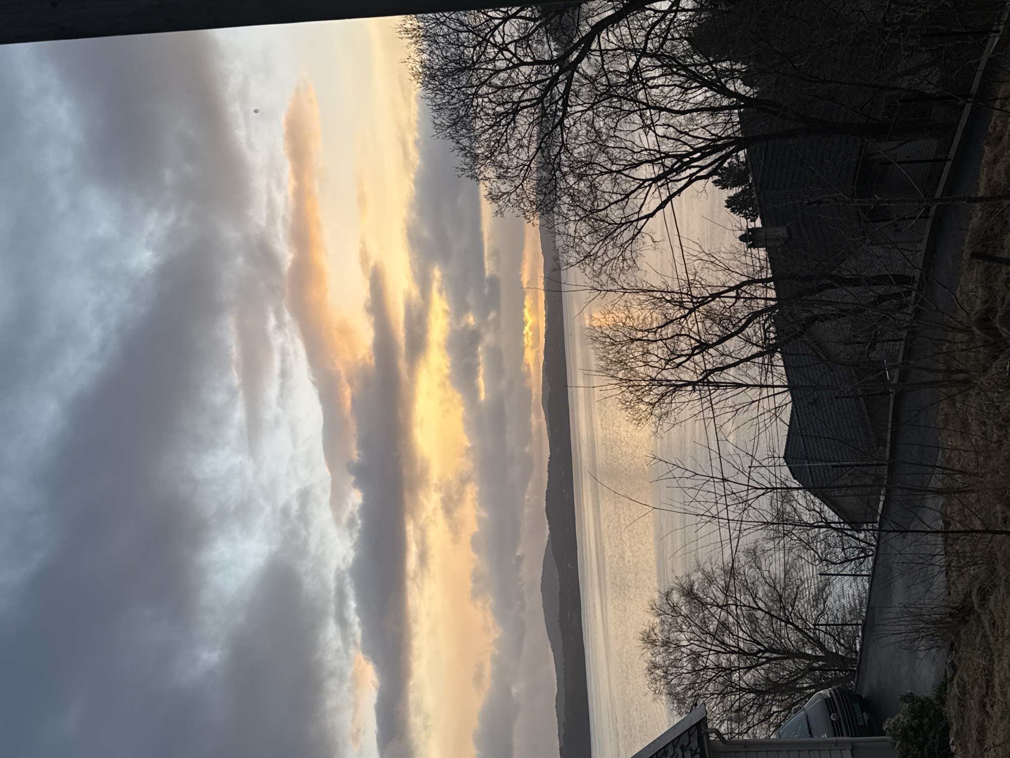 The image displays a panoramic view of a coastal residential area in Bergen, Norway, observed during either sunrise or sunset. The sky is partially overcast, with dark grey and blue-grey clouds in the upper section, transitioning to a band of bright orange and yellow light along the horizon, illuminating the undersides of central clouds. A faint, circular light anomaly is visible in the upper right sky. A large, calm body of water, identified as a fjord or bay, occupies the mid-ground, reflecting the warm light from the sky with shimmering streaks across its still surface. A chain of dark, undulating mountains or hills forms the distant horizon, silhouetted against the bright sky. The immediate foreground and mid-ground feature a sloped landscape with sparse, bare deciduous trees and dry brush, indicative of a cool season. An asphalt road or driveway curves downwards from left to right. On the far left, a light-colored house with a dark roof is partially visible, adjacent to which a dark grey van, bearing the Norwegian license plate "SV 37341", is parked facing away from the viewer. Another house with a dark roof is partially visible in the lower right, largely obscured by tree branches. Thin, dark utility lines traverse horizontally across the mid-ground, intersecting the bare tree branches. A wire fence is present near the water's edge below the road. No individuals, actions, or interactions are depicted within the scene.