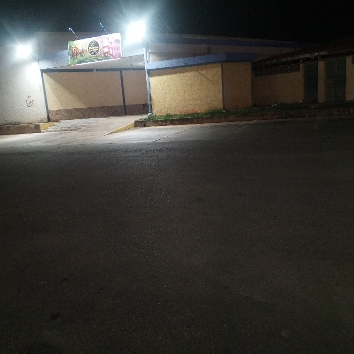 Illuminated by bright overhead lights, a commercial building stands at night. The structure exhibits a combination of yellow and white walls, with a blue accent line. A prominent billboard featuring the words "Port Town" adorns the top. A paved parking area stretches out in front of the building, showing some imperfections and patches of darkness. The scene is quiet, with minimal visible detail beyond the building and the surrounding pavement.