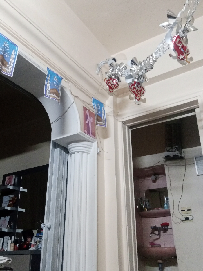 The image depicts an indoor scene within a building in Joubar Municipality, Syria, characterized by decorative elements and views into two adjacent rooms. In the foreground and central frame, light beige walls and a ceiling are visible. A string of small, blue rectangular banners, each featuring Arabic calligraphy and images of a mosque or minaret, is strung along the top edge of an arched doorway on the left. A white decorative column, consistent with a Corinthian capital, supports the archway on the viewer's left. Suspended from the ceiling towards the upper right is a silver metallic garland adorned with reflective elements and red, ornate heart-shaped cutouts. Through the archway on the left, an interior room is partially visible. A person with dark hair is seated or positioned at a counter or desk in the lower-left, mostly obscured. Behind them, a dark-colored shelving unit holds various bottles, containers, and small decorative items. Through a rectangular doorway on the right, a bathroom is visible. The bathroom features pink tiled walls and a pink ceramic sink with a metal faucet. A mirror is mounted above the sink, and a few items rest on a shelf beneath the mirror. Above the sink, a white electrical appliance, possibly a fan or heater, is mounted high on the wall. A white electrical outlet with associated wiring is visible on the wall to the right of the bathroom doorway. No explicit actions or interactions are discernible.