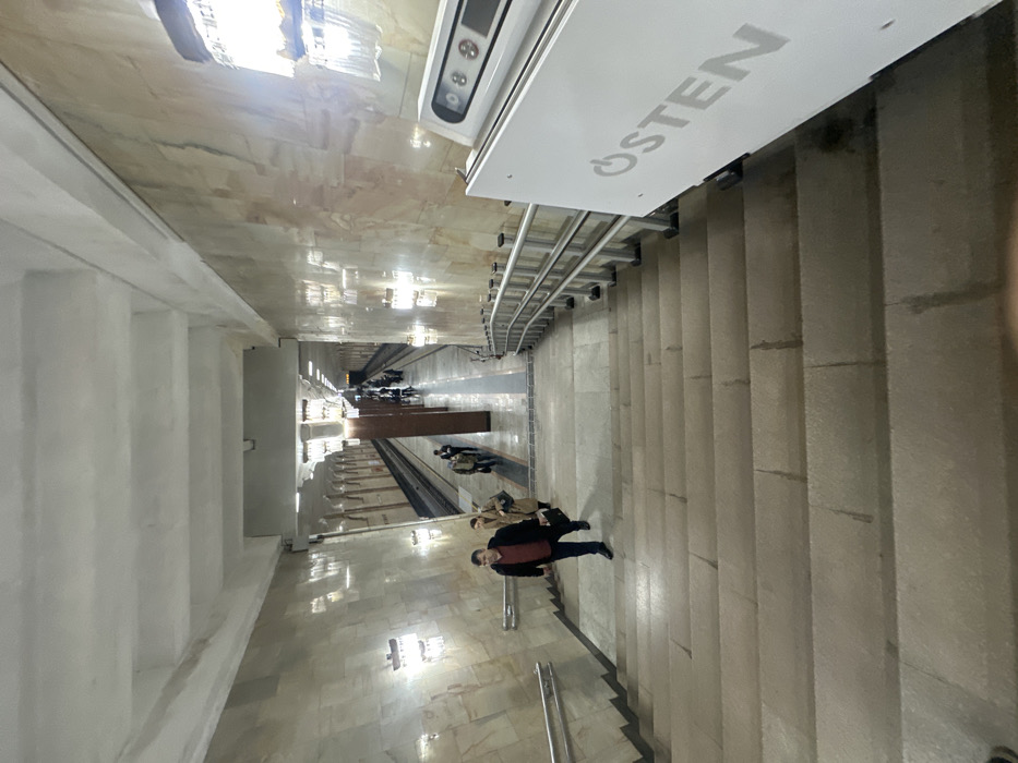 - "The image displays an interior view of a metro station in Tashkent, Uzbekistan, likely Ming O'rik Station, observed from an elevated position looking down a wide staircase towards the platform" by FM-ciE9C3, licensed under CC BY 4.0