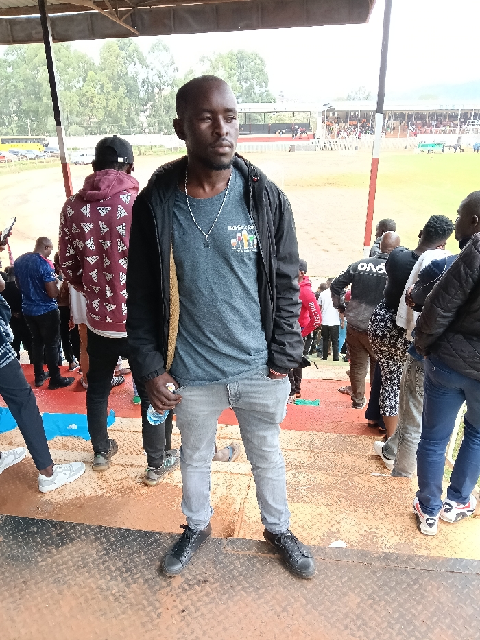 An adult male with a closely shaven head and a short beard stands in the foreground, facing slightly to the right of the camera with a neutral expression. He wears a black jacket over a dark grey t-shirt with a colorful graphic (partially obscured, showing "Our Emojis"), light grey slim-fit jeans, and dark lace-up shoes. A silver chain with a small cross pendant hangs from his neck. He holds a clear plastic water bottle in his left hand, resting against his left thigh. His right hand is partially in his jeans pocket. He stands on a brownish-orange checkered metal floor, indicative of a stadium platform or walkway. Behind and to the sides of the primary subject, numerous other individuals are visible standing and observing the surrounding environment. To the subject's immediate left, a person wearing a maroon Adidas hooded sweatshirt with an all-over logo pattern is seen from behind. To the subject's right, a group of people includes an individual wearing a black long-sleeved shirt with "OND" printed in white. The background clearly depicts a sports stadium, identifiable as Gusii Stadium in Kisii, Kenya. A wide, light brown dirt or sand track is visible beyond the immediate standing area. Further back, tiered concrete stadium stands, some featuring red and black paint, are moderately populated with spectators. Beyond the stadium structure, a line of green trees is visible, with several parked vehicles (cars and a bus) beyond the track perimeter. Overhead, a metal support structure for a roof or canopy is present, and the sky appears overcast.