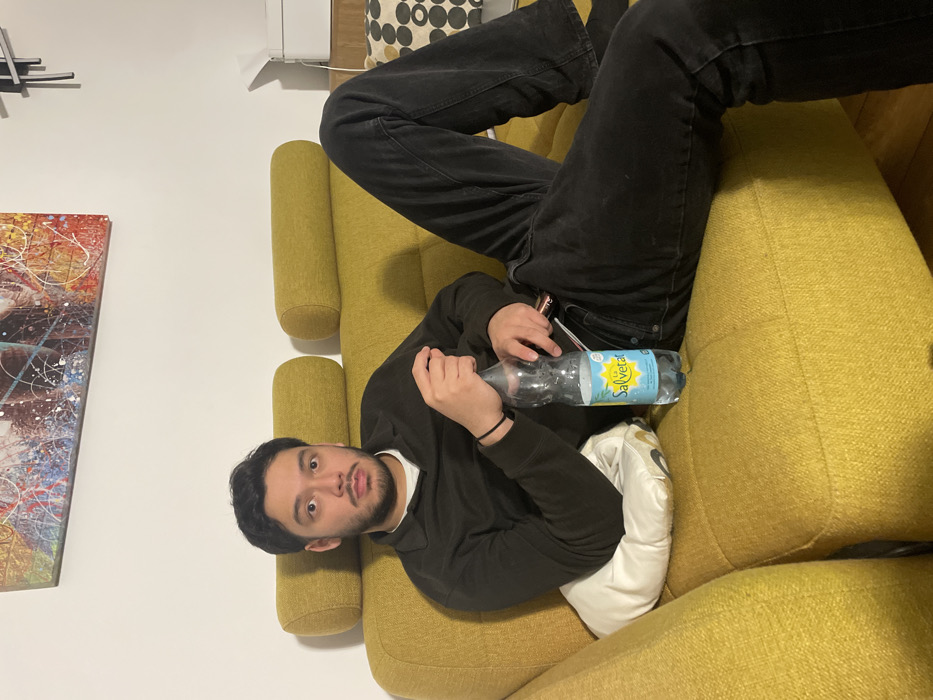 - "A young adult male with dark hair, a light beard, and an olive complexion is seated reclining on a chartreuse fabric sofa in an indoor setting" by FM-VHE4f2, licensed under CC BY 4.0