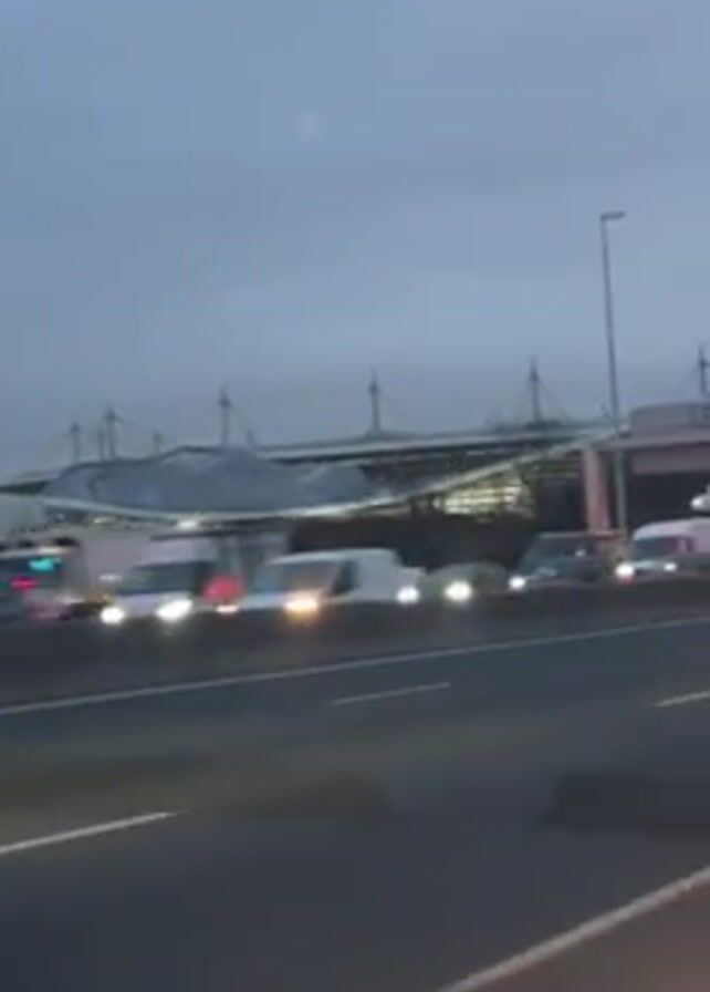 view from a moving car on a highway. Other cars and trucks are visible on the highway as the car passes under an overhead structure, likely an exit or entrance ramp. In the distance, a large building or stadium with a distinctive, curved roof structure can be seen. The sky is overcast, suggesting it's early morning or late evening. The focus is on the movement of vehicles and the backdrop of the stadium.