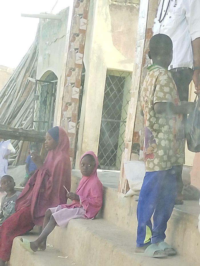 Several children are sitting on the steps of a building. Two girls wear headscarves, one in maroon and the other in pink, with matching attire. A boy stands on the steps to the right, holding a plastic bag. Another boy is seated to the left. A portion of a man wearing a white shirt is visible behind the standing boy. The building behind them has windows and a column with a decorative pattern. Wooden scaffolding leans against the building to the left.