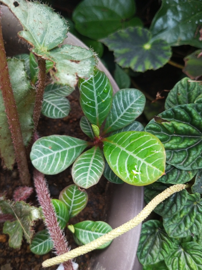 This image presents a close-up, top-down view of several potted plants situated in Mindat, Myanmar. The central subject is a small plant featuring approximately eight elliptical, dark green leaves with prominent white venation, arranged in a rosette pattern. The central stem of this plant is reddish-brown. Multiple clear water droplets are visible on the surfaces of the upper leaves. To the left, a plant with a reddish-brown, hairy stem is visible. Its ovate leaves are a lighter green and exhibit a textured surface, with some minor damage or irregularities along the edges. Emerging from the soil in the lower center is an elongated, fuzzy, reddish-purple structure, resembling an inflorescence. In the lower right quadrant, a pale yellow, elongated, and textured structure, consistent with a catkin or spike inflorescence, extends diagonally upwards. Adjacent to this yellow structure, dark green leaves with a distinctly corrugated or crinkled texture are present. The background features blurred green foliage, including at least one rounded leaf displaying a concentric pattern of dark and lighter green. Dark brown soil is visible around the plant bases, contained within the light grey or brown rim of a cylindrical planter. No human subjects or animals are present in the scene.