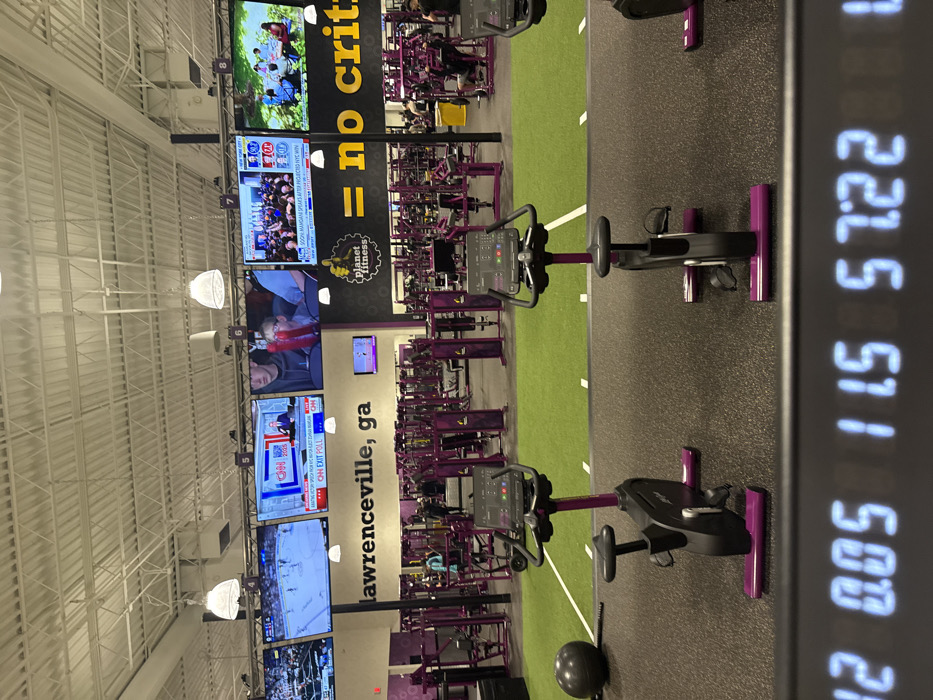 A gym interior with rows of purple exercise machines, including stationary bikes. TVs are mounted on the wall, displaying news and other content. A banner reads "Planet Fitness = no critics." A display on a machine in the foreground reads "12 0.05 115 5722 1." Text on the wall reads "Lawrenceville, ga" and "Soon Magazine Spears after non-projected NYC Win."