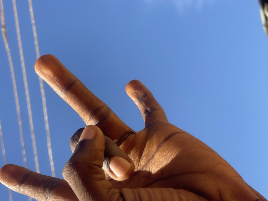 - "A close-up, upward-angle photograph captures a human hand, exhibiting a dark skin tone, performing a specific gesture against a clear blue sky in Birnin Kebbi, Nigeria" by FM-KB4Iz1, licensed under CC BY 4.0