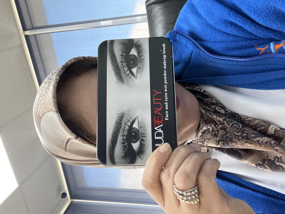 A person is depicted indoors, holding a rectangular black makeup tin horizontally across their face, obscuring the forehead, eyes, and nose. The visible lower portion of the face shows part of the chin and mouth. The individual wears a light brown patterned hijab, a blue fleece jacket with a zipper, and a white undershirt. Their right hand, adorned with a multi-band ring featuring alternating rows of small silver-toned and gold-toned beads, grips the lower left corner of the tin. The tin's front displays a black-and-white image of a pair of heavily made-up eyes with prominent eyelashes and defined eyebrows. Below this image, the text "HUDABEAUTY" appears in white and red, followed by "Face and eyes wet powder makeup brush" in smaller white lettering. The background consists of large vertical windows with blue blinds or curtains, revealing a clear blue sky outside, suggesting a daytime scene. A small, dark surveillance camera is mounted high in the left corner of the room. A dark chair is partially visible to the right. The indoor environment appears to be an office or commercial space. The specific location within the city of Meknes, Morocco, is not discernible from the visual evidence.