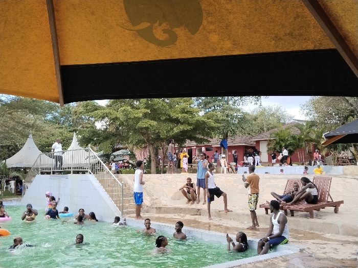 The image displays an outdoor recreational facility, viewed partially from beneath a large yellow and black striped canopy featuring a dark emblem, possibly an elephant. In the foreground, a swimming pool with greenish water contains approximately 15 individuals, primarily children and young adults, engaged in swimming, wading, or using inflatable rings. Several people are seated along the pool's edge. To the left, a white tiled structure with integrated stairs ascends to an elevated platform, where two white conical tents are positioned. One adult male in a white shirt stands on this platform. To the right of the pool, a terraced area constructed from light-colored concrete or stone accommodates multiple individuals standing, walking, or seated on two wooden lounge chairs. In the midground and background, several red-walled buildings with brown-tiled roofs are visible, interspersed with numerous green trees and dense foliage. The scene collectively shows approximately 30-40 individuals engaged in various leisure activities. The location is an outdoor facility in Unknown, Unknown.