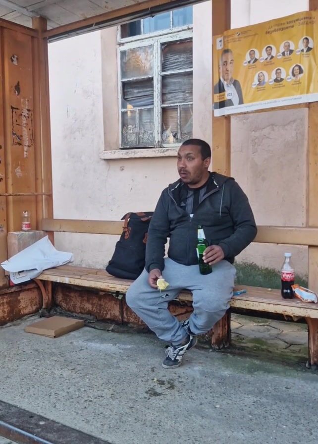 A man is sitting on a wooden bench at what appears to be a bus stop. He is holding a bottle of beer in his right hand and a piece of food in his left, which he is eating. He takes a drink from the bottle. Next to him are a black backpack, a bottle of Coca-Cola, and some wrappers. The bus stop has a rusty, worn appearance. Behind the bench is a building with a boarded-up window and a poster featuring political candidates. The concrete floor of the bus stop has debris scattered around it. The video is shot in daylight.