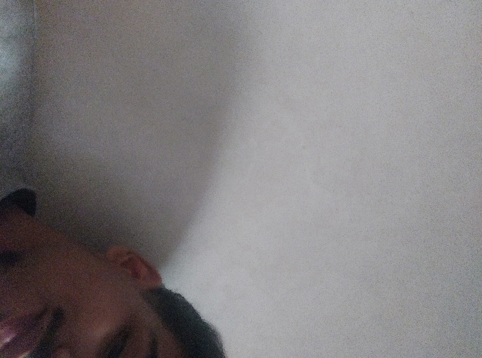 This image presents a close-up view captured under low-light conditions, characterized by noticeable image grain. The majority of the frame, approximately the upper two-thirds, is occupied by a plain, light grey or off-white wall. A soft, diagonal shadow is cast upon the wall, extending from the upper right towards the center-left. In the lower right quadrant, a human subject is partially visible. This individual is identified as male, with only the right side of his face, including the ear, a portion of the cheek, and dark, short hair above the ear, observable. The subject's mouth area shows a subtle curve, suggesting a faint expression, and a dark garment is visible at the bottom edge of the frame. No direct engagement with the camera is apparent, and no specific actions or interactions are discernible. The environment consists solely of the uniform wall, implying an indoor or sheltered setting. This scene is situated in the city of Fez, Morocco.