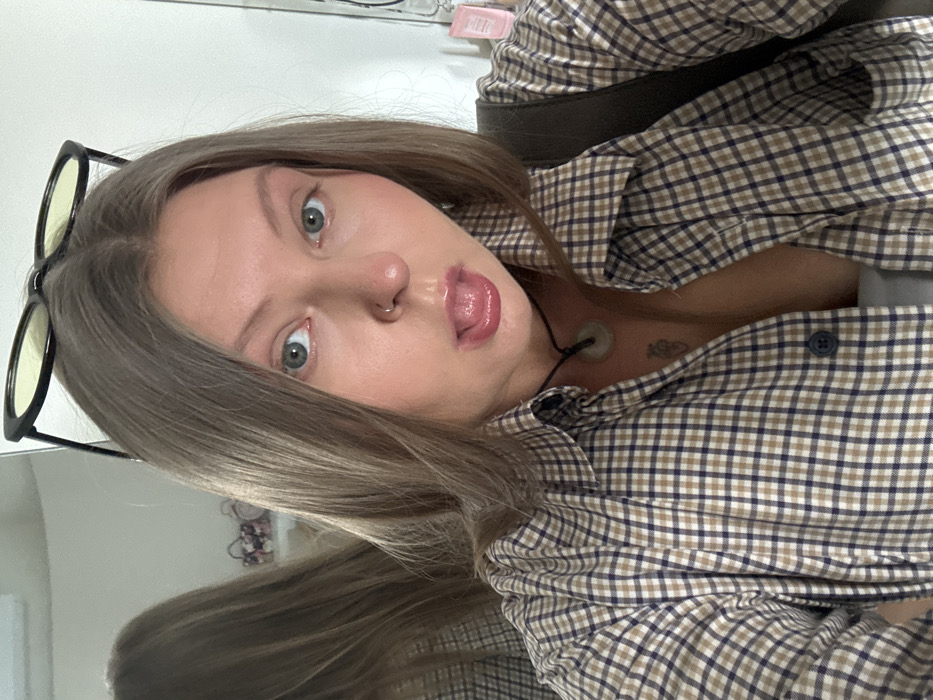 A young woman poses indoors. She has light brown hair, blue eyes, and a nose ring. She sticks out her tongue, wearing black-rimmed glasses on her head. She wears a tan and blue plaid shirt and a black necklace with a jade pendant. A faint tattoo is visible on her chest. Part of a reflection can be seen to the left. A dark strap crosses her shoulder.