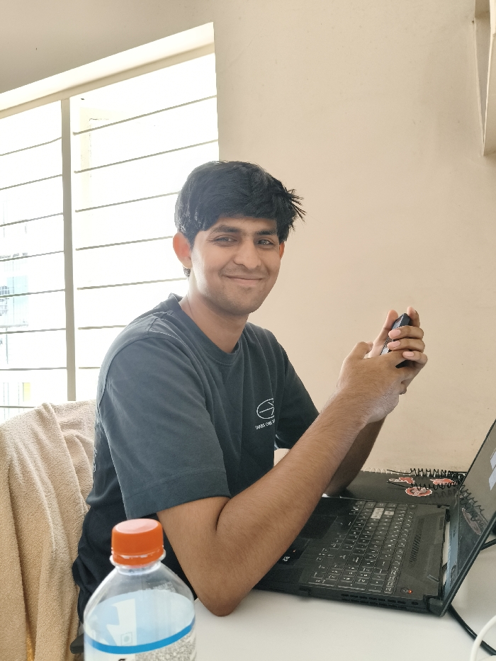 A young man with dark hair smiles while holding a small, dark object in his hands. He sits at a white desk with a laptop in front of him. A water bottle with an orange cap is visible on the left. A beige blanket is draped over a chair behind him. A window with horizontal blinds is behind and to his left, providing natural light. The wall behind him is light beige. He is wearing a dark gray t-shirt with a white design.