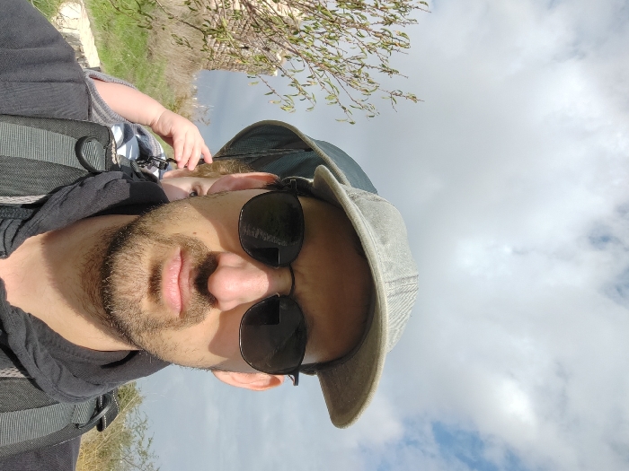 An adult male is prominently featured in a close-up selfie, positioned outdoors in Rosh HaAyin, Israel. He wears a grey baseball cap, dark sunglasses, and a black hooded sweatshirt, exhibiting a beard and mustache. Behind him, partially visible over his left shoulder, is a child in a carrier. The child wears a dark bucket hat and a patterned top, with one hand visible and raised. The background consists of a sloping, grassy terrain with dry vegetation. To the left, a stone wall or ruin is visible, along with sparse trees and bushes. The sky above is partly cloudy, displaying both white clouds and patches of blue.