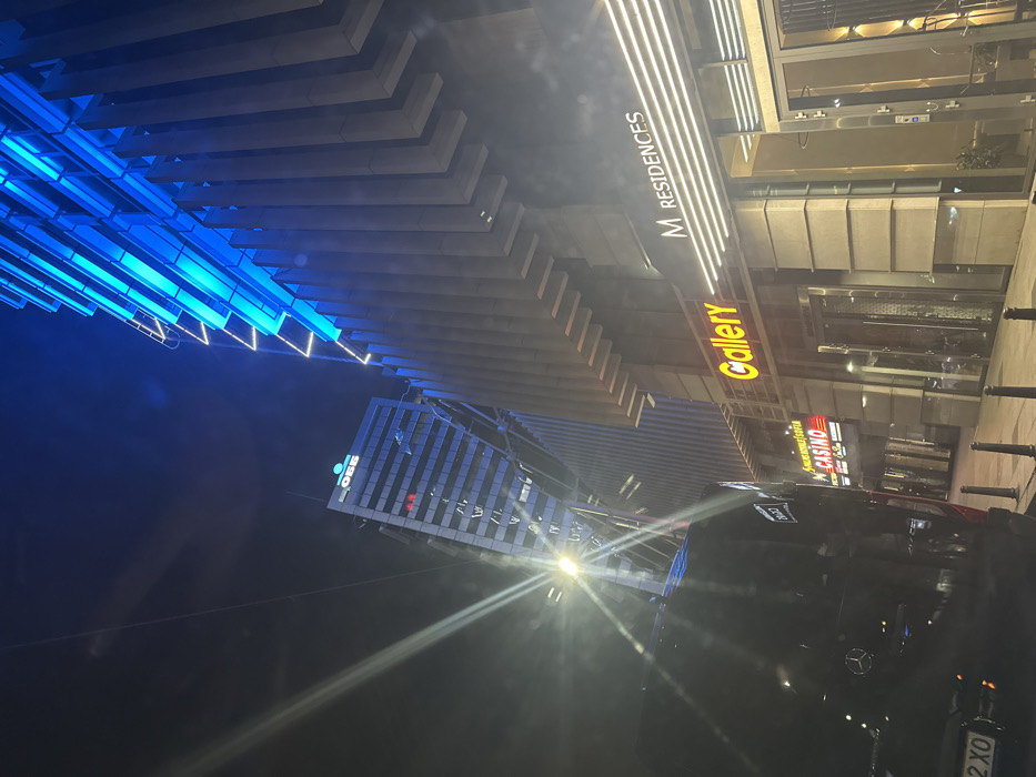 This nighttime image captures an urban street scene in Sofia, Bulgaria, located near Tsarigradsko shose. In the foreground, a dark-colored vehicle, possibly a Mercedes-Benz (partial license plate "2 XO" visible), occupies the lower-left. A bright streetlamp to its right emits a strong starburst flare. The midground features the M Residences building on the right, a modern high-rise with a facade composed of vertical fins and prominent blue horizontal strip lighting on its upper sections. At street level, an illuminated yellow sign reads "Gallery," and to its right, another white illuminated sign displays "M RESIDENCES" above a row of horizontal light strips. Further left along the street level, a red and white sign for "PULSAR NOBLES SOFIA CASINO" is visible. Dark bollards line the sidewalk in front of these establishments. In the background, behind the streetlamp, the OBB Headquarters building is visible. This multi-story building features a dark facade with numerous illuminated windows, including a red rectangular light on one floor. The OBB logo (a green circle with two dots and "OBB" text) is illuminated at the building's pinnacle. The sky is dark, indicating night. No individuals are discernible.