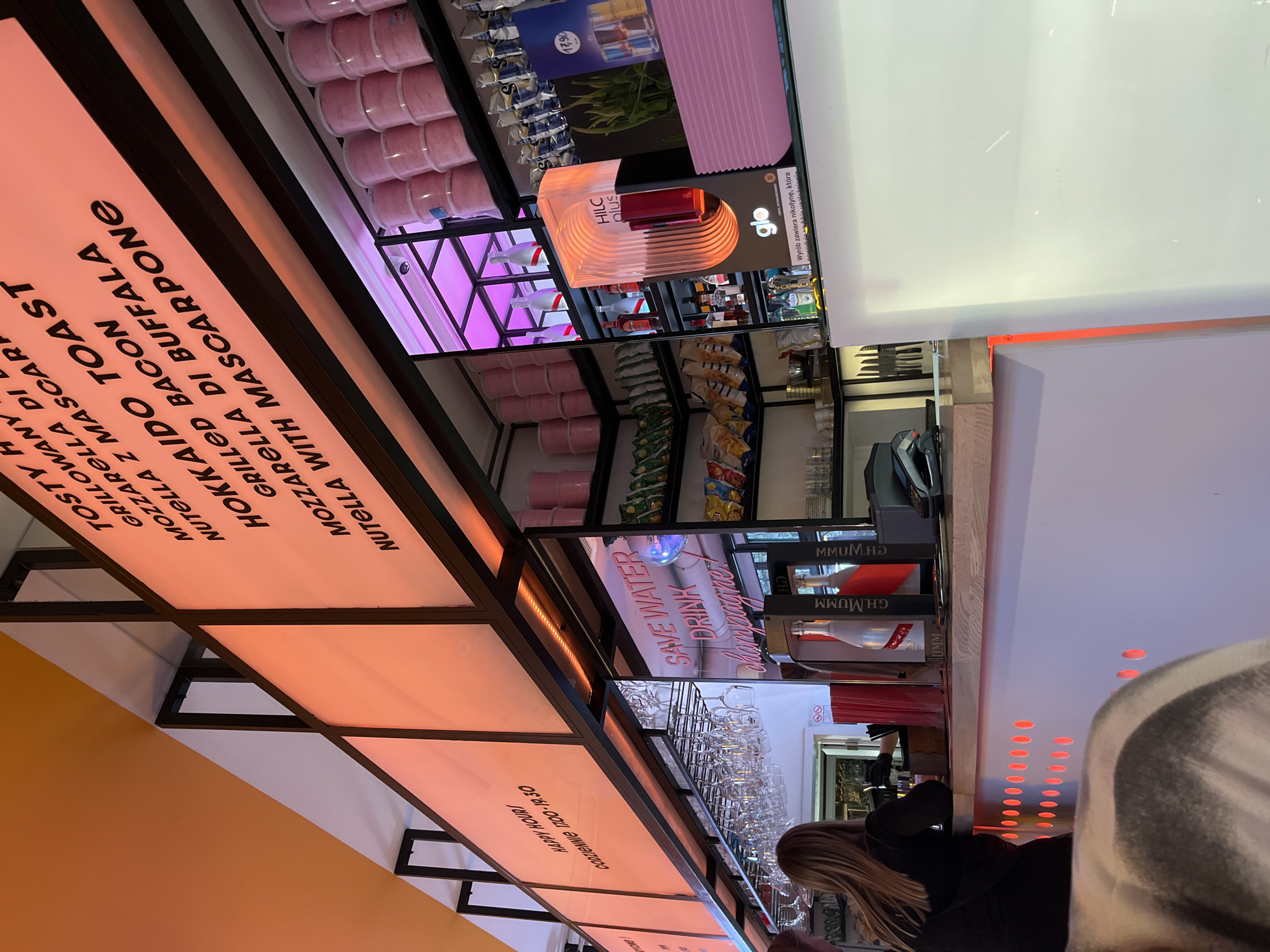 interior of a restaurant or cafe in Krakow, Poland. Overhead signage displays the menu items: "TOSTY H, GRILLOWANY, MOZZARELLA DI, NUTELLA Z MASCAR," "HOKKAIDO TOAST, GRILLED BACON, MOZZARELLA DI BUFFALA," and "NUTELLA WITH MASCARPONE." A row of merchandise is arranged above the signage, including items such as Red Bull and glo products. Wine glasses are arranged on shelves, and a woman with long blonde hair is standing near the bar area. G.H.MUMM Champagne branding is visible, along with the phrase "SAVE WATER, DRINK Champagne." The sign "HAPPY HOURI codzienne 17:00-19:30" indicates that the establishment offers a happy hour from 5:00 PM to 7:30 PM.