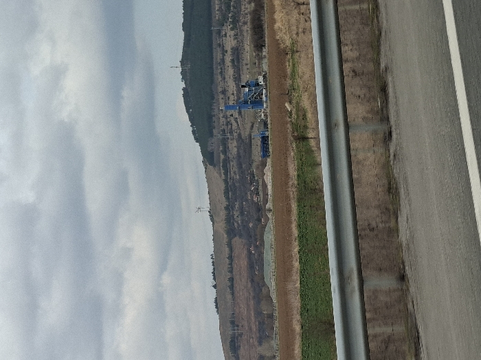 The image depicts a rural-industrial landscape in Dolna Dikanya, Bulgaria, under an overcast sky. In the foreground, a multi-lane asphalt roadway with white lane markings is partially visible, separated from the middle ground by a metallic silver guardrail. Beyond the guardrail, dry, brown earth transitions into a rectangular patch of green vegetation, followed by larger expanses of reddish-brown tilled land. To the mid-right, a blue industrial facility, possibly a processing plant, with multiple vertical structures and conveyors, is situated amidst large piles of light-colored aggregate material. Further in the mid-background, small clusters of buildings with reddish roofs suggest a distant settlement. The background is dominated by a range of hills covered in dry vegetation and sparse trees. A section of dense dark green coniferous forest is visible on the rightmost hill. On the hilltops, a white two-bladed wind turbine is present on the left, and multiple communication towers (lattice and monopole) are visible on the central and right hills. The sky is entirely covered by a uniform layer of grey clouds. No individuals or specific actions are discernible.