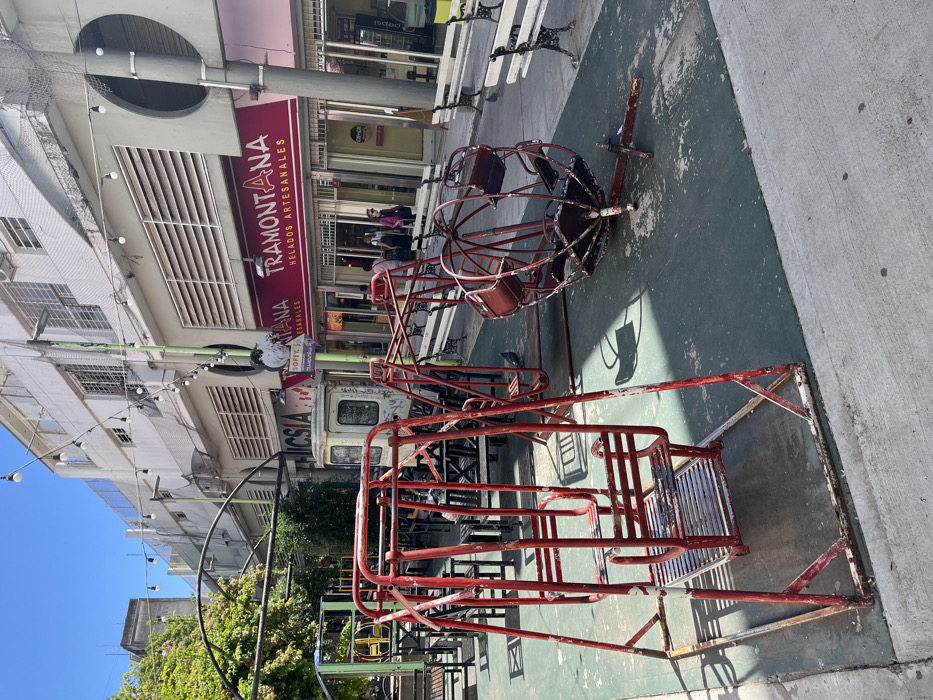 A playground structure occupies a sidewalk with a carousel and swing set rendered in faded red paint. The ground beneath is painted green. Buildings line the background, including one bearing the sign "TRAMONTANA HELADOS ARTESANALES." Benches are visible in the distance. A blue sky is present, suggesting a bright day. The image's orientation is rotated 90 degrees counterclockwise.