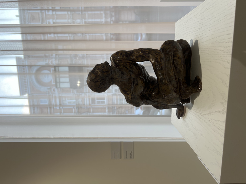 A dark-toned, possibly bronze, sculpture of a crouching human figure is positioned on a light-colored wooden pedestal in an interior space