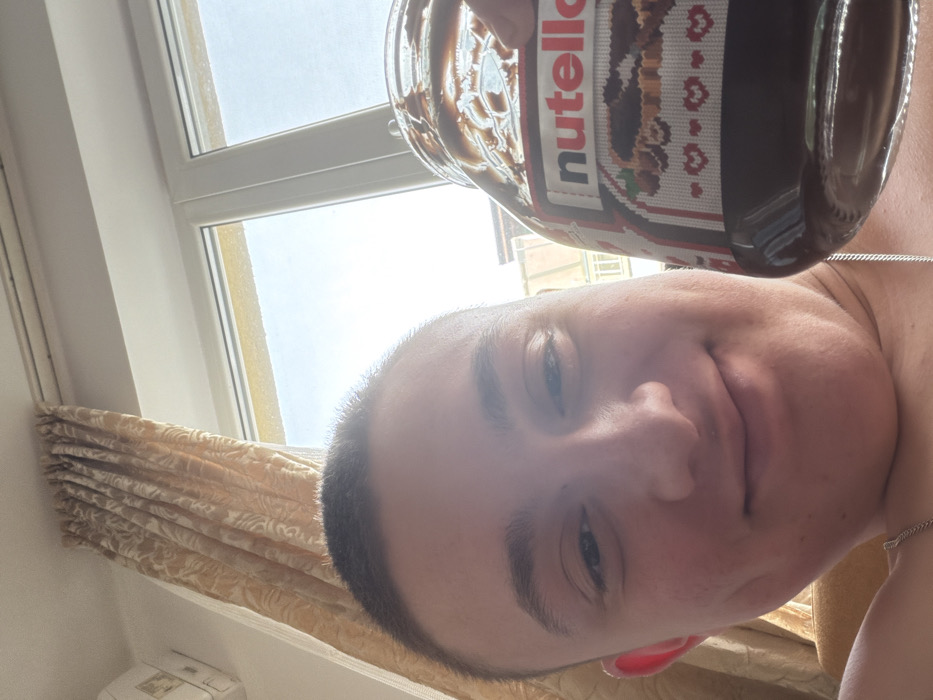 An individual, appearing to be a young male, is depicted in a close-up, selfie-style photograph. He has short, buzzed hair, fair skin, and is looking directly at the camera with a slight smile. A silver chain is visible around his neck. The subject is holding a large, partially consumed glass jar of Nutella chocolate hazelnut spread, which displays a festive "Christmas sweater" style label featuring hearts and a reindeer motif. Chocolate residue lines the interior walls of the jar. The background reveals an indoor setting illuminated by natural light entering through a large window with white frames. To the left of the window, a cream or gold-colored textured curtain is visible. A white wall-mounted air conditioning unit is partially observable in the upper left corner of the frame. Through the window, elements of residential architecture, including portions of buildings with light-colored facades and reddish-brown tiled roofs, are visible under a bright sky. The precise location within the city of Burgas, Bulgaria, cannot be determined from the visual information provided.