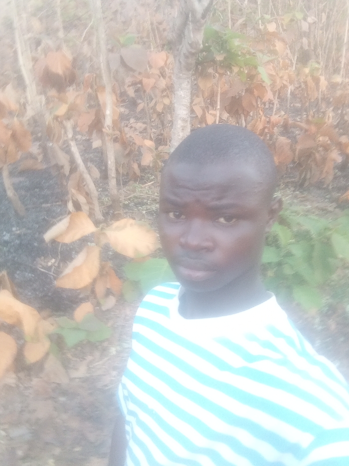 A young male with dark skin and short, dark hair is depicted from the chest up, positioned centrally in the frame. He wears a short-sleeved t-shirt with horizontal stripes in white and light blue. His gaze is directed forward, towards the viewer, with a neutral facial expression. The background consists of dense, natural vegetation, primarily trees and shrubs with a mix of dried brown leaves and some green foliage. The ground visible behind the subject appears dark. The scene is outdoors, consistent with a natural or uncultivated area within the city of Okeni, Nigeria.