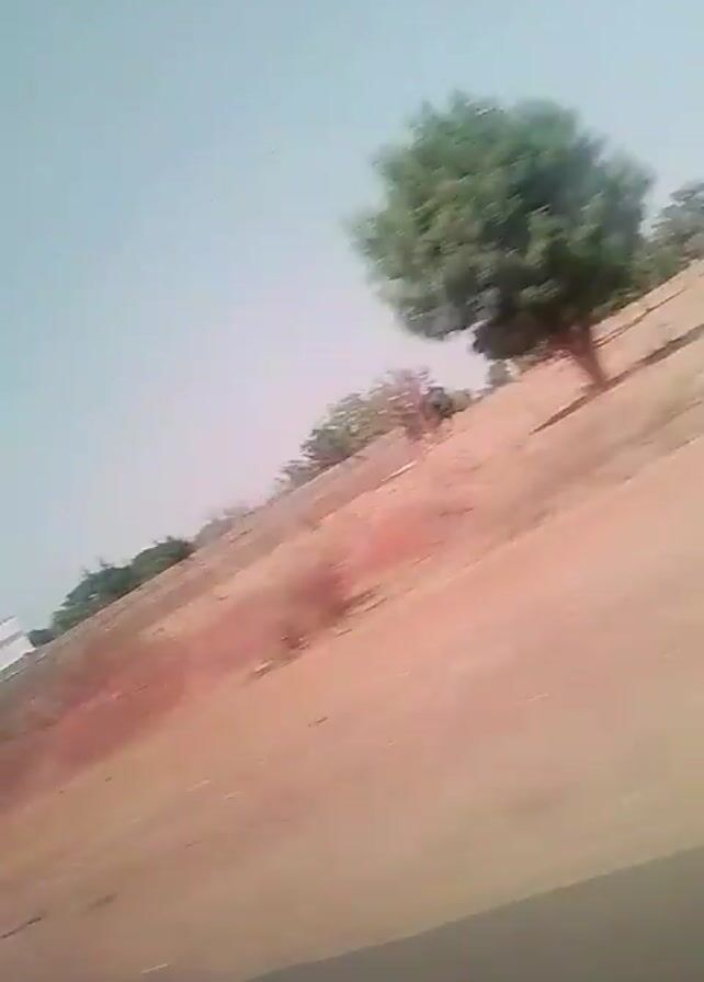 The video, shot from a moving vehicle, shows a rural landscape. The ground is dry and reddish-brown, with sparse vegetation and occasional trees. In the distance, there are white buildings. As the camera moves, a person on a motorcycle wearing a yellow shirt drives by. The sky is pale blue. The quality of the video is somewhat grainy and shaky. The phrase "SHOT ON P65_" is watermarked in the corner.
