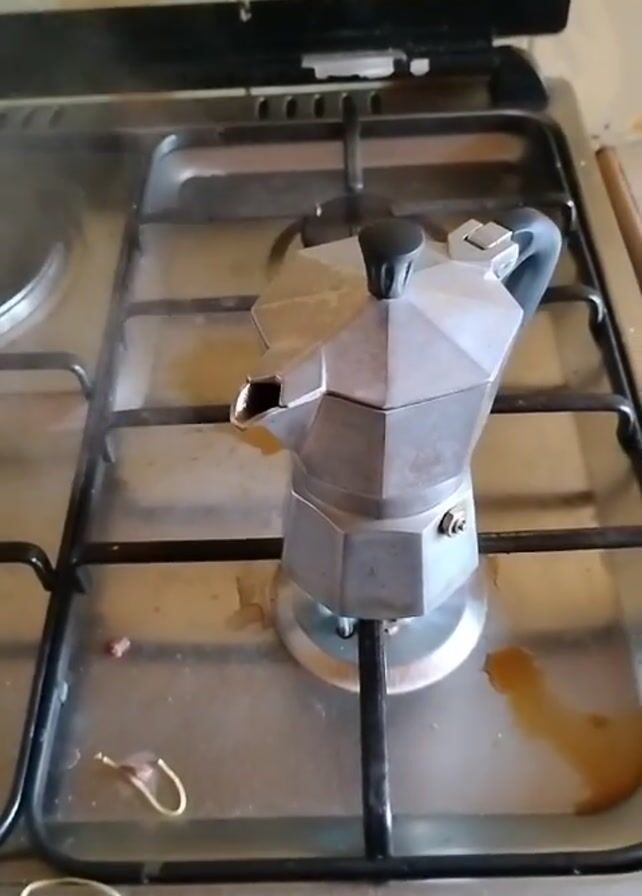 - "An eye-level, close-up shot shows a Moka pot on a gas stove" by FM-EjnL92, licensed under CC BY 4.0