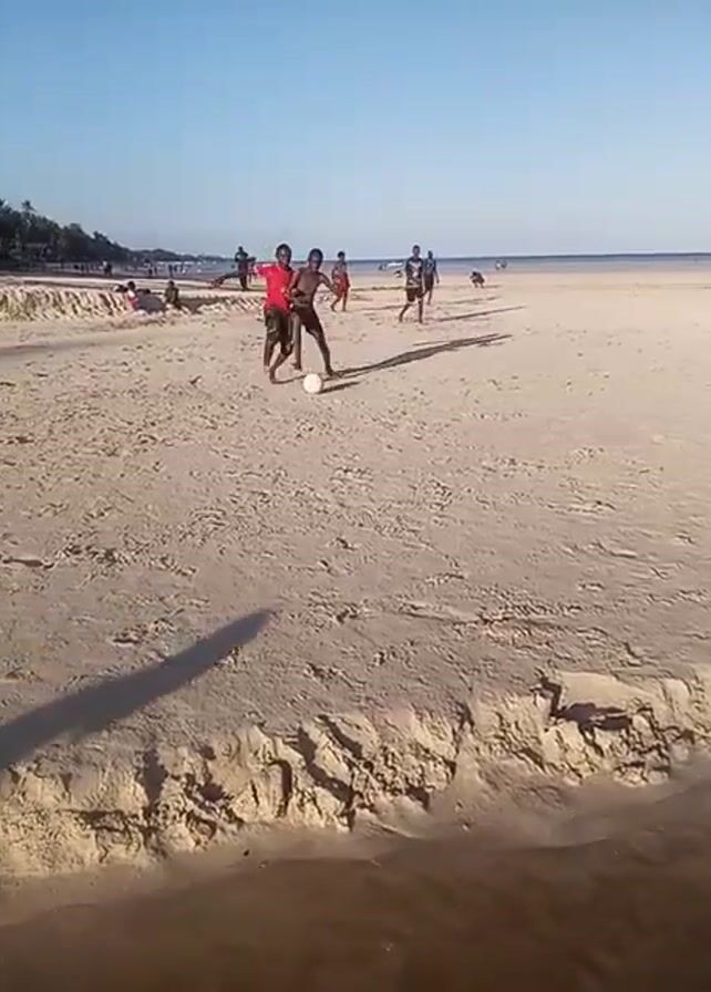 The video captures a scene of a beach with several individuals engaged in a soccer game under a clear, blue sky