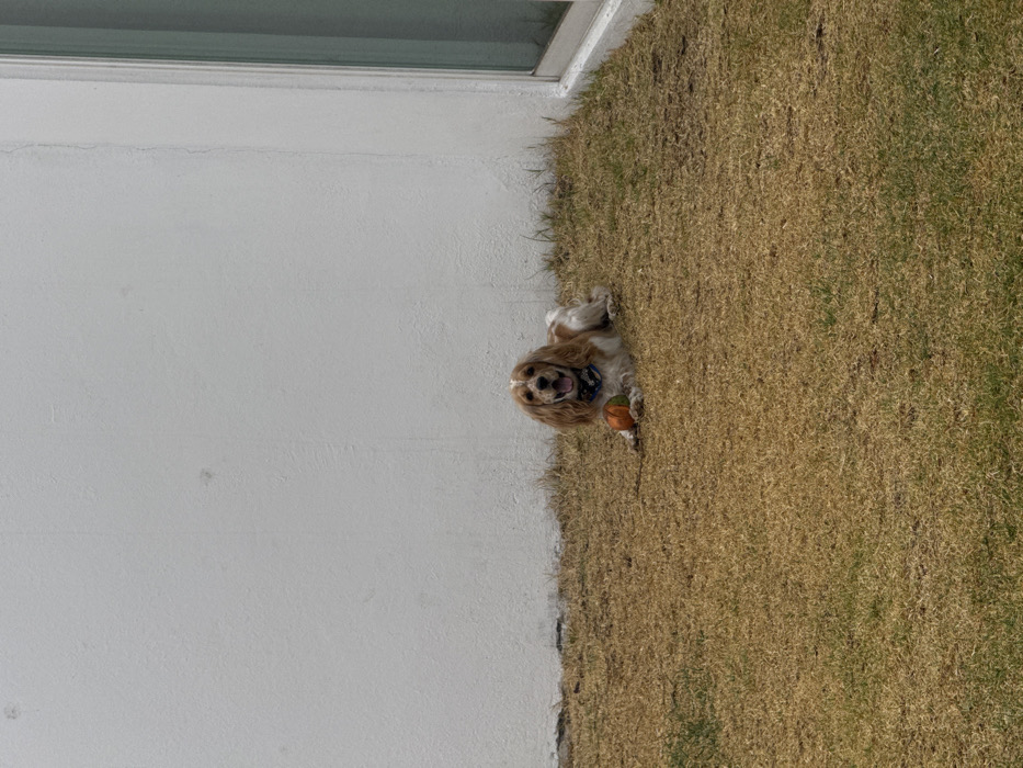 The scene depicts an outdoor area in Heroica Puebla de Zaragoza, Mexico. A tan and white Cocker Spaniel dog is positioned on a patch of dry, predominantly brown-yellow grass with interspersed green sections. The dog lies facing the observer, its mouth partially open, exhibiting its tongue. It wears a blue, patterned bandana around its neck. An orange, green, and black multi-colored spherical object (a ball) is situated directly in front of the dog's forepaws. The background features a plain, light grey stucco wall spanning the left and central areas. This wall terminates at a corner on the right, where a vertical white-framed window or glass door is observed. No human subjects are visible. The lighting is diffused, indicating an overcast sky or indirect illumination.