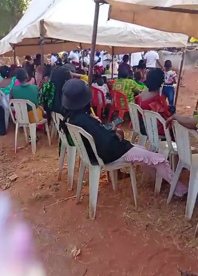 crowd of people sitting in chairs under white tents at an outdoor event. The ground is red dirt. Most people are seated, facing forward, watching something happening in front of them. The attendees are wearing colorful clothing. White plastic chairs are arranged in rows. There is lively music playing in the background.