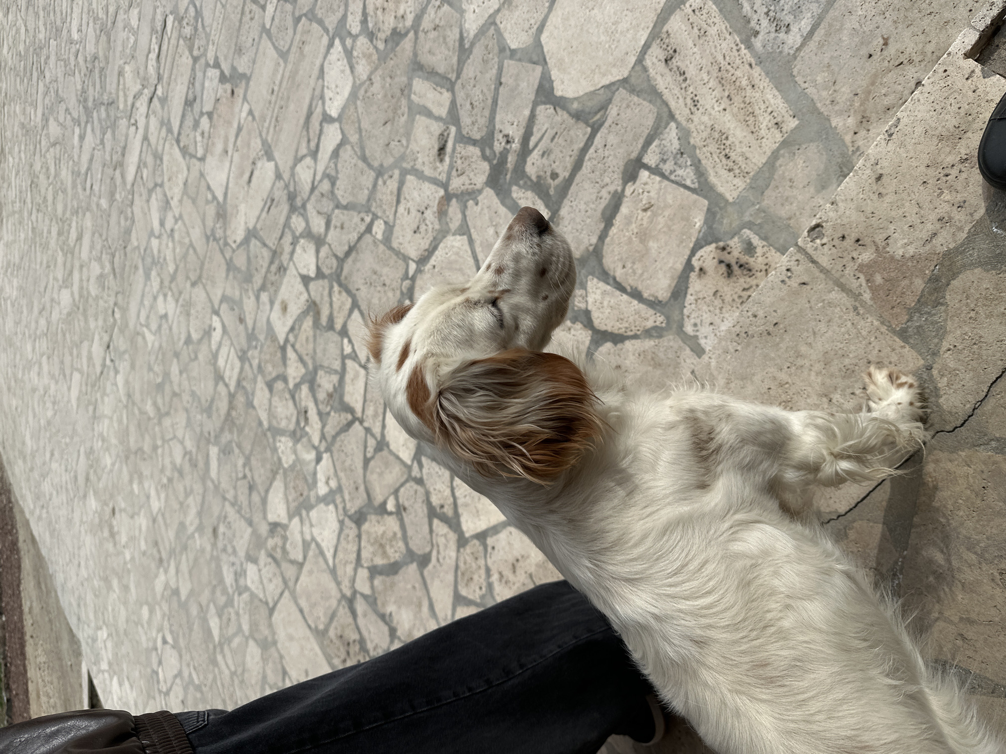 The scene depicts a white dog with light brown patches on its head and ears, positioned on an irregularly paved stone surface in Areni, Armenia. The dog, which appears to be a medium-sized breed with long, wavy fur, is oriented toward the right of the frame with its eyes appearing closed or squinting. A human subject is partially visible on the left side of the image, wearing dark black jeans and a dark brown jacket sleeve with a ribbed cuff. A black shoe is also visible at the bottom edge of the frame. The ground is covered with light-colored, angular stone slabs, possibly travertine, set with dark grout lines. Natural light illuminates the scene, casting distinct shadows across the pavement.