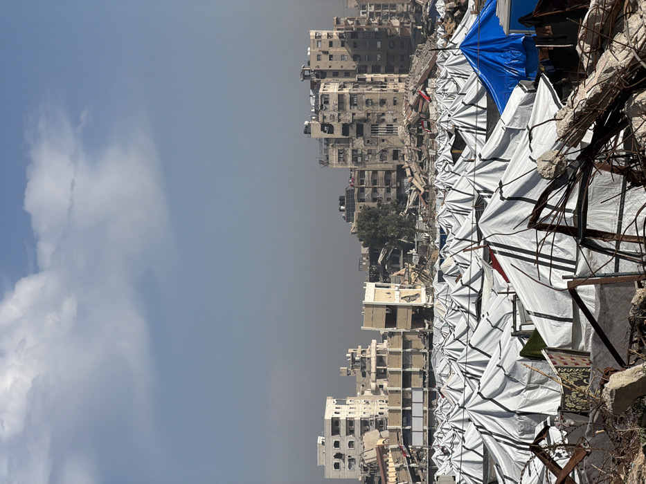 - "The image presents a wide view of a densely packed temporary settlement within a heavily damaged urban environment in the city of Gaza, Palestinian Territory, under a partly cloudy blue sky" by FM-PSI0J3, licensed under CC BY 4.0