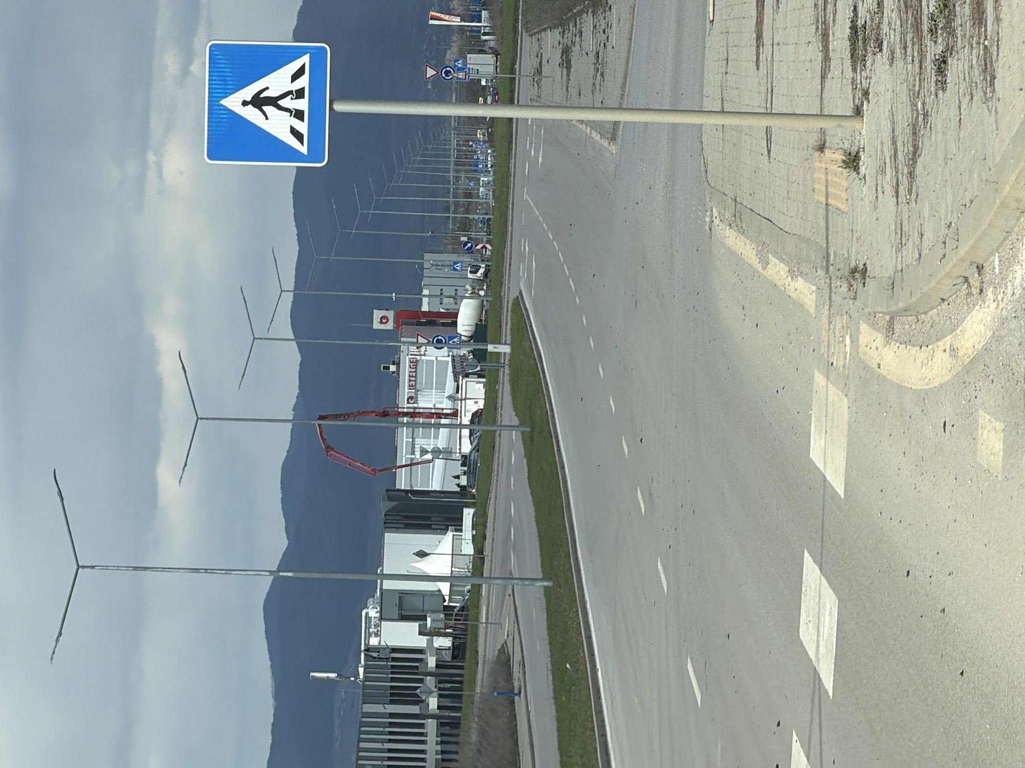 The image captures a pedestrian crossing sign on an unnamed road in Bozhurishte, Bulgaria. A road is on the right, marked with dashed white lines. A curb separates the road from the adjacent area. In the background, there's a view of industrial buildings, mountains, streetlights and a cloudy sky.