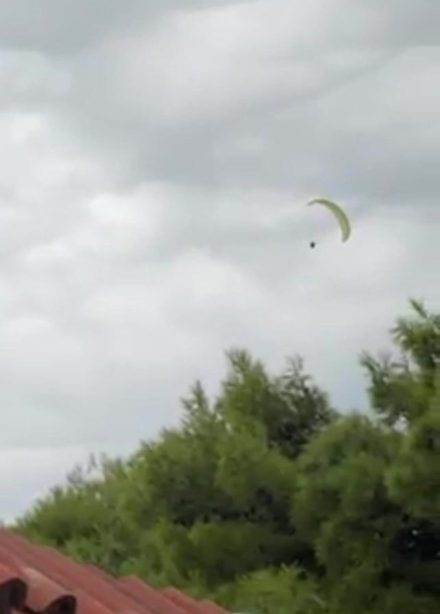 The video depicts two paragliders in a cloudy sky above green trees. A terracotta tile roof is visible in the foreground. The paragliders are distant and small in the frame. One is yellow-green, and the other is blue and red. They appear to be drifting in the wind. The sky is overcast with grey clouds.