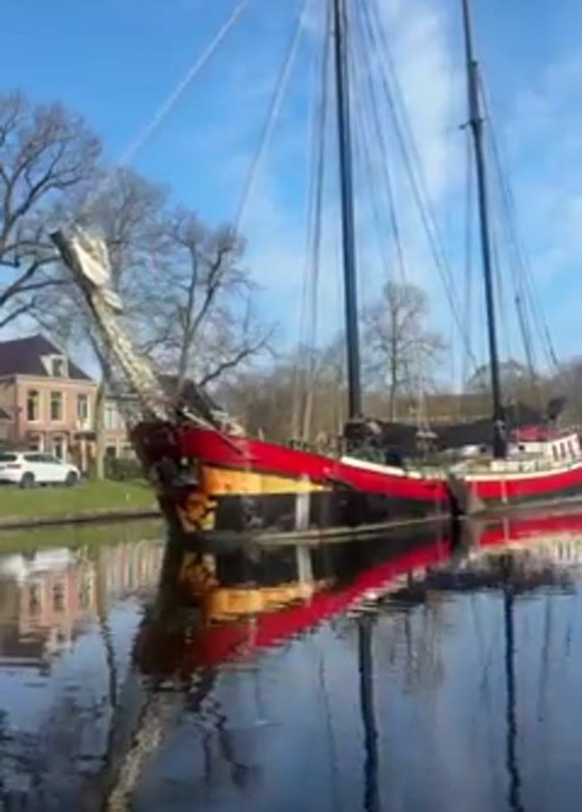 A full shot captures a large, two-masted sailing ship moored in a calm canal