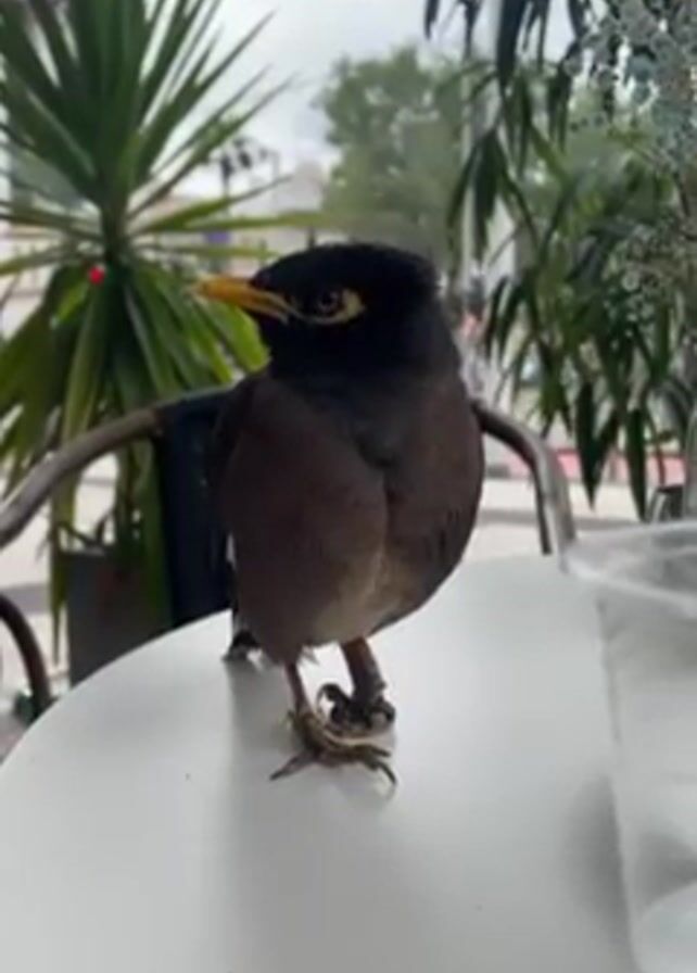 A myna bird sits on a small, round, white table outside. The bird has brown feathers on its body, black feathers on its head, and a yellow beak. It has black eyes. The bird stands with its legs and toes splayed a bit. In the background are plants and a blurry cityscape. A clear, plastic glass and white napkin are on the table to the right of the bird.