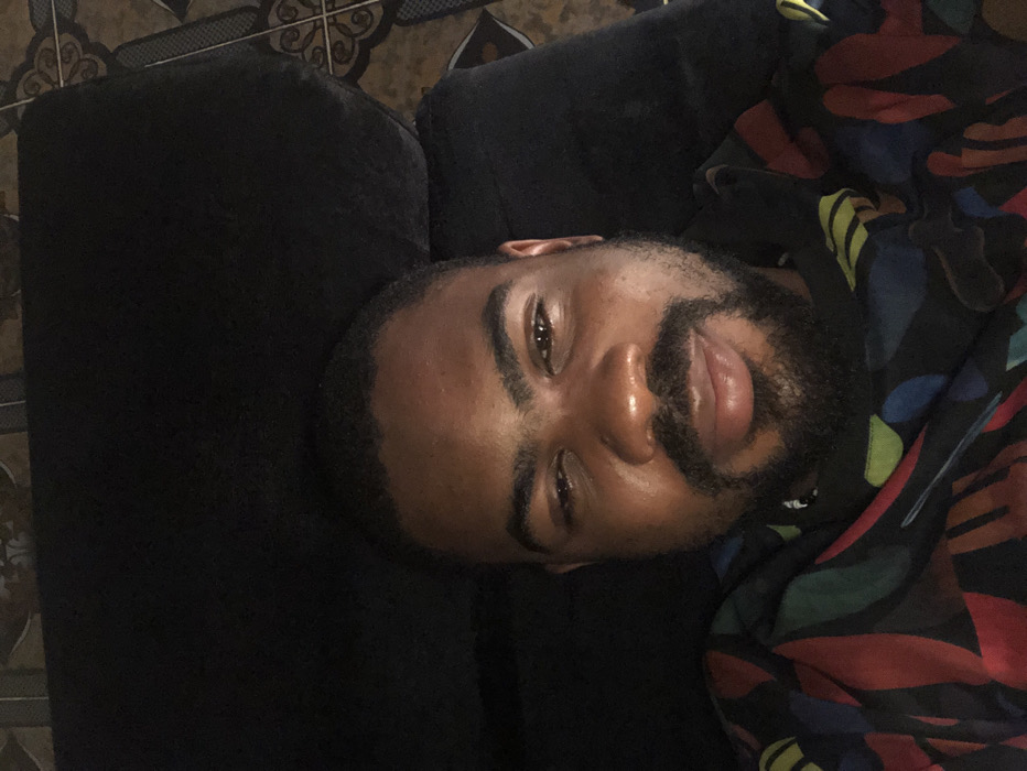 The image depicts an adult male of African descent, positioned vertically in a close-up indoor shot, likely a selfie