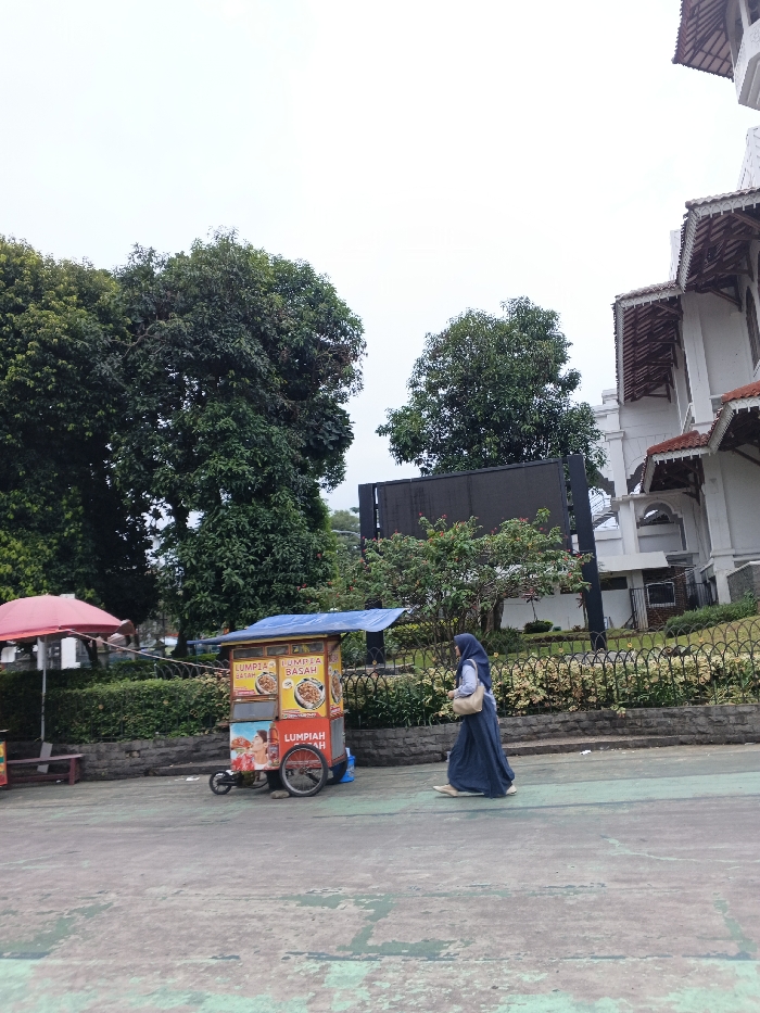 This outdoor scene is likely located in an Indonesian-speaking country, such as Indonesia or Malaysia, rather than Ho Chi Minh City, Vietnam, as indicated by the Indonesian text "LUMPIAH BASAH" and "LUMPIAH BATANG" on the vendor cart. The image depicts a concrete or paved area with faded green markings under an overcast sky. In the midground, a brown and yellow two-wheeled mobile food cart with a blue tarp canopy is stationary. The cart prominently displays food items and text in Indonesian: "LUMPIAH BASAH" (wet spring rolls) and "LUMPIAH BATANG" (spring roll sticks). To the left of the cart, a partially visible red umbrella suggests another vendor setup. A single female pedestrian is walking from left to right, midway between the food cart and a low black metal fence. She wears a dark blue long dress, a lighter blue or grey top, and a dark blue hijab, carrying a light-colored handbag over her right shoulder. Behind the pedestrian and the fence, a landscaped area with green bushes and shrubs slopes upwards. Further back, a large, dark rectangular structure, possibly a billboard or an unlit digital display, is visible amidst lush green trees. To the far right, a multi-story white building with intricate architectural details, including multiple terracotta-tiled sloped roofs and decorative eaves, rises against the sky. Dense green foliage from large trees dominates the left side and background of the image.