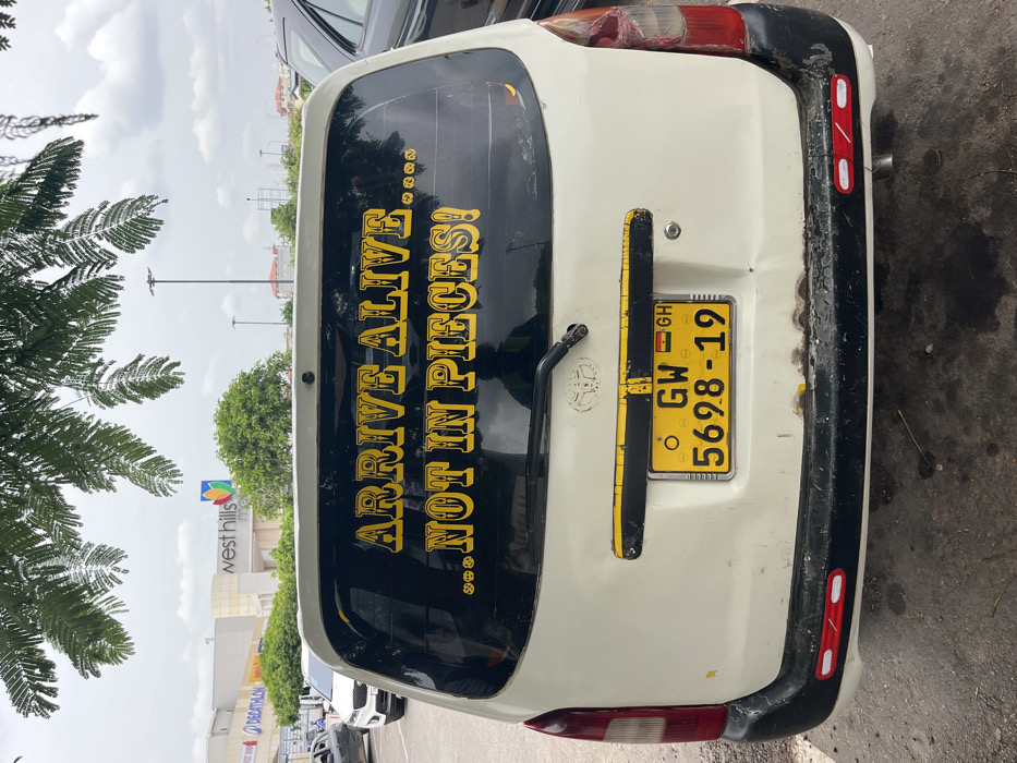 The image displays the rear view of a white station wagon, likely a Toyota Probox or Succeed, situated in a parking area in Mile 11, Ghana