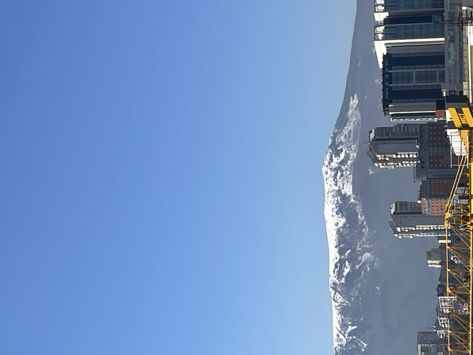 The image displays an urban landscape in Sofia, Bulgaria, under a clear, bright blue sky. In the background, the snow-capped Vitosha mountain range extends across the horizon, its peaks covered in white snow contrasting with the darker lower slopes. The mid-ground and foreground feature a cityscape composed of various multi-story buildings, indicating a densely built environment. Notable structures include several modern residential buildings with balconies and dark window frames, and commercial-type buildings, one with a dark facade and numerous glass windows, situated to the right. A prominent yellow lattice-boom construction crane is visible in the lower left and center foreground, suggesting active development or construction. No individuals, specific actions, or interactions are discernible.