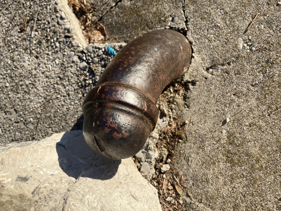 - "A singular, dark, curved metallic object, displaying significant surface corrosion with reddish-brown rust over a dark brown to black base, is depicted resting on the ground in Cetinje, Montenegro" by FM-rOKEu2, licensed under CC BY 4.0