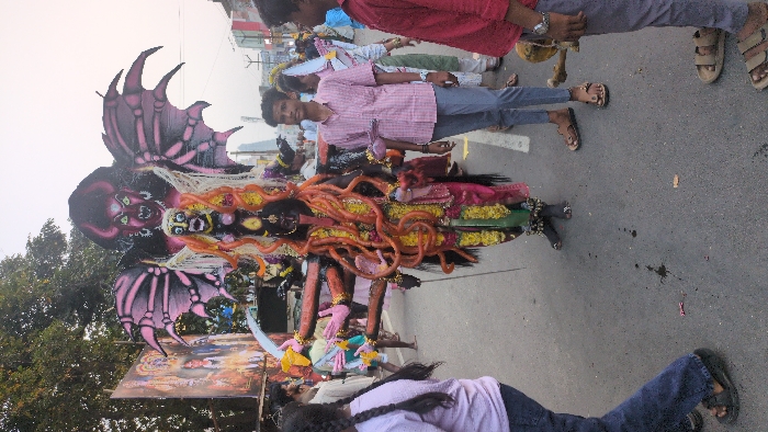 The scene depicts a public street in Tiruvannamalai, India, during what appears to be a religious procession or festival. **Central Subject:** A person in an elaborate costume stands prominently in the middle of an asphalt road, portraying a multi-armed deity, likely the Hindu goddess Kali. The costume features dark skin, a long red tongue protruding from the mouth, and numerous elongated orange and black dreadlock-like elements. Eight arms are visible, adorned with pink hands. The lower body is dressed in a pink and green skirt-like garment with ankle bells. **Accompanying Structure:** Behind and above this central figure is a large, dark-colored structure. It includes a prominent red-faced, horned demon-like entity with large, pink, bat-like wings extending outwards. Another smaller, black-faced demonic figure is visible above the horned entity. This structure appears to be an integral part of the costume or a float element. **Individuals:** * **Foreground Left:** The back of a person with long, dark braided hair, wearing a light purple top and blue jeans, walking towards the left. * **Mid-Right:** A young male, approximately teenage, stands facing forward, wearing a light pink checkered button-up shirt, blue trousers, and brown sandals. His expression is neutral. * **Foreground Right:** The lower torso and legs of another male, wearing a red shirt, grey trousers, and light brown sandals. He holds a golden, ornate object, possibly a ceremonial horn or musical instrument. * **Background:** Several other individuals are visible throughout the background, indicating a crowd. A large banner depicting religious figures is visible on the far left. **Environment:** The setting is an outdoor street, with an asphalt surface showing some dark stains and minor debris. Trees are visible in the upper left, and urban structures, including buildings, utility poles, and wires, line the street in the distance under a pale sky.