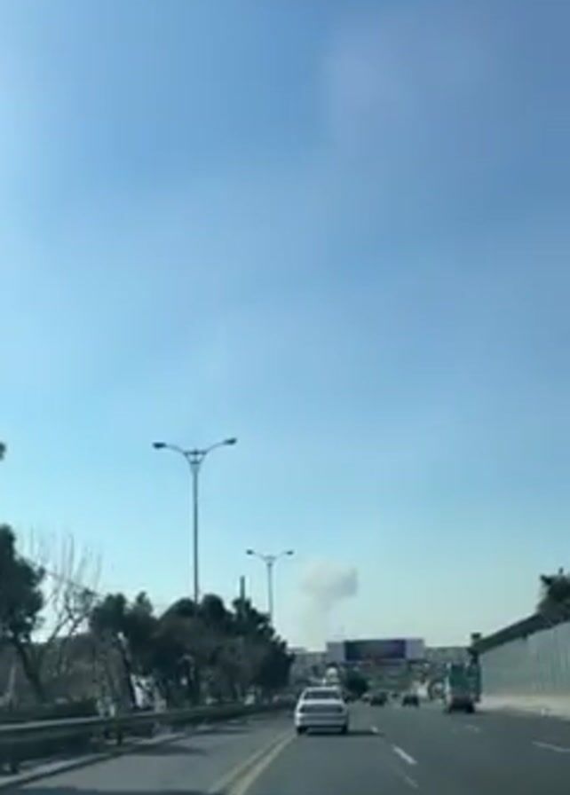 view from inside a vehicle driving on a highway. The sky is clear and blue. There are other cars on the road and trees on the side. In the distance, there is a plume of smoke rising into the air. There is also a large sign with the word "Voo" on it.