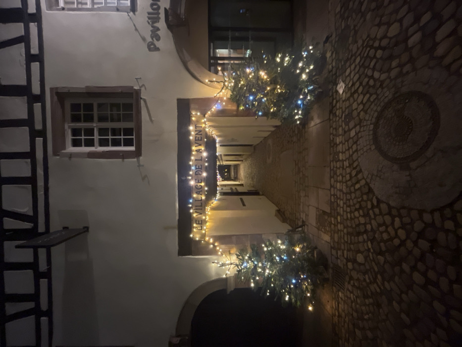 A narrow passageway, "LE VILLAGE DE L'AVENT", is illuminated by string lights