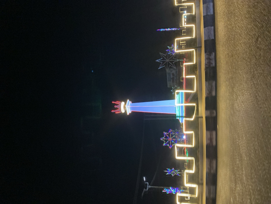 At night, a lit tower with a red crown-like top fades into a blue and white gradient. To the tower's right, a wall is decorated with lights in a step pattern and star-shaped ornaments. The wall fades into the pavement. The background is dark.