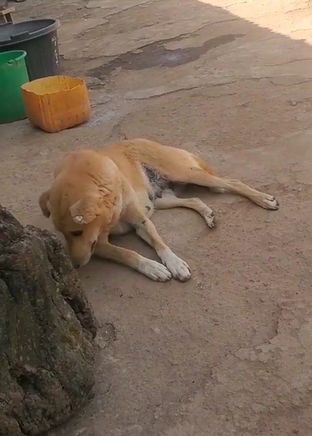 light brown, slender dog lying down on a cement patio. The dog is stretched out on its side, with its head down near its front paws. A dark-colored, textured tree stump is visible in the lower-left corner. Behind the dog, there are several colorful buckets or containers: one dark gray or black, one green, and one yellow. In the background, there is a corrugated metal fence or wall. The area appears to be an outdoor space, possibly a yard or courtyard. The ground is sunlit, casting shadows on the patio. The dog is still and seems to be resting.