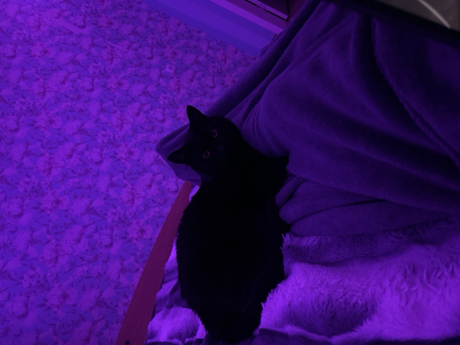A black cat sits on a bed with floral-patterned wallpaper in the background. The room is illuminated with a strong violet light, casting an overall purple hue on the scene. The cat's eyes are visible, reflecting light. The bed has a light grey blanket, with a fluffy white texture underneath. The corner of the bed frame is visible on the left side.