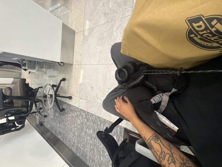 From an overhead perspective, a person sits in a chair with a beige tote bag bearing a "Dickies" logo nearby. Headphones rest on a black bag on their lap. The person wears grey pants and black clothing. A tattooed arm and hand are visible. An office chair and a white countertop or wall feature in the background. The floor consists of light grey tiles.