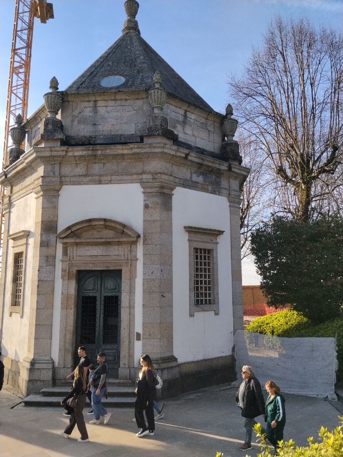 A historic stone building with a dome-shaped roof and decorative urns stands prominently. Several people walk in front of the building, some ascending steps towards the arched entrance. A tall yellow construction crane is visible in the background, juxtaposed with leafless trees and green bushes. Sunlight casts long shadows on the ground, creating a bright and airy atmosphere.