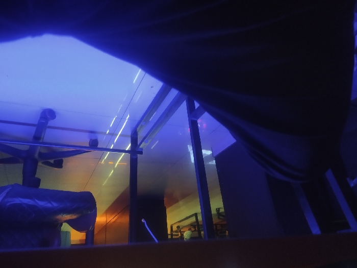 The image depicts an indoor, low-light environment in Tashkent, Uzbekistan, viewed from a low perspective, likely from under a table. A human leg, clad in dark blue fabric (trousers), occupies the lower-left to mid-left foreground. Above, a dark, horizontal surface, possibly a tabletop, partially obscures the upper frame. In the mid-ground, a metal table frame structure with vertical and horizontal supports is visible. To the right, a dark office chair with a five-star wheeled base and a textured backrest is positioned. The floor is composed of light-colored, possibly white, square tiles, illuminated predominantly by a strong blue light. Parallel linear reflections of a brighter, possibly white or yellow, light source are visible on the tiled floor. A warm, orange-yellow light emanates from the background, providing a contrast to the prevailing blue illumination. No specific actions or interactions are discernible beyond the implicit presence of an individual seated at a table.